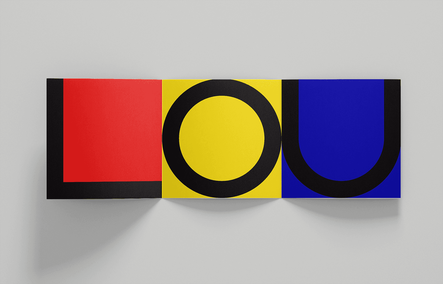 Birth Announcement for Lou is a fold-out card where the name appears only when fully opened. Inspired by De Stijl, I built each letter from simple geometric shapes instead of using a typeface, creating a playful and minimal design.